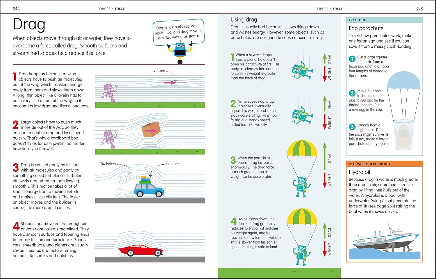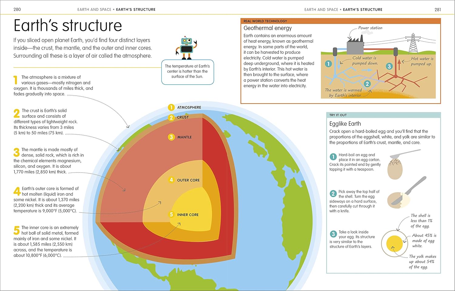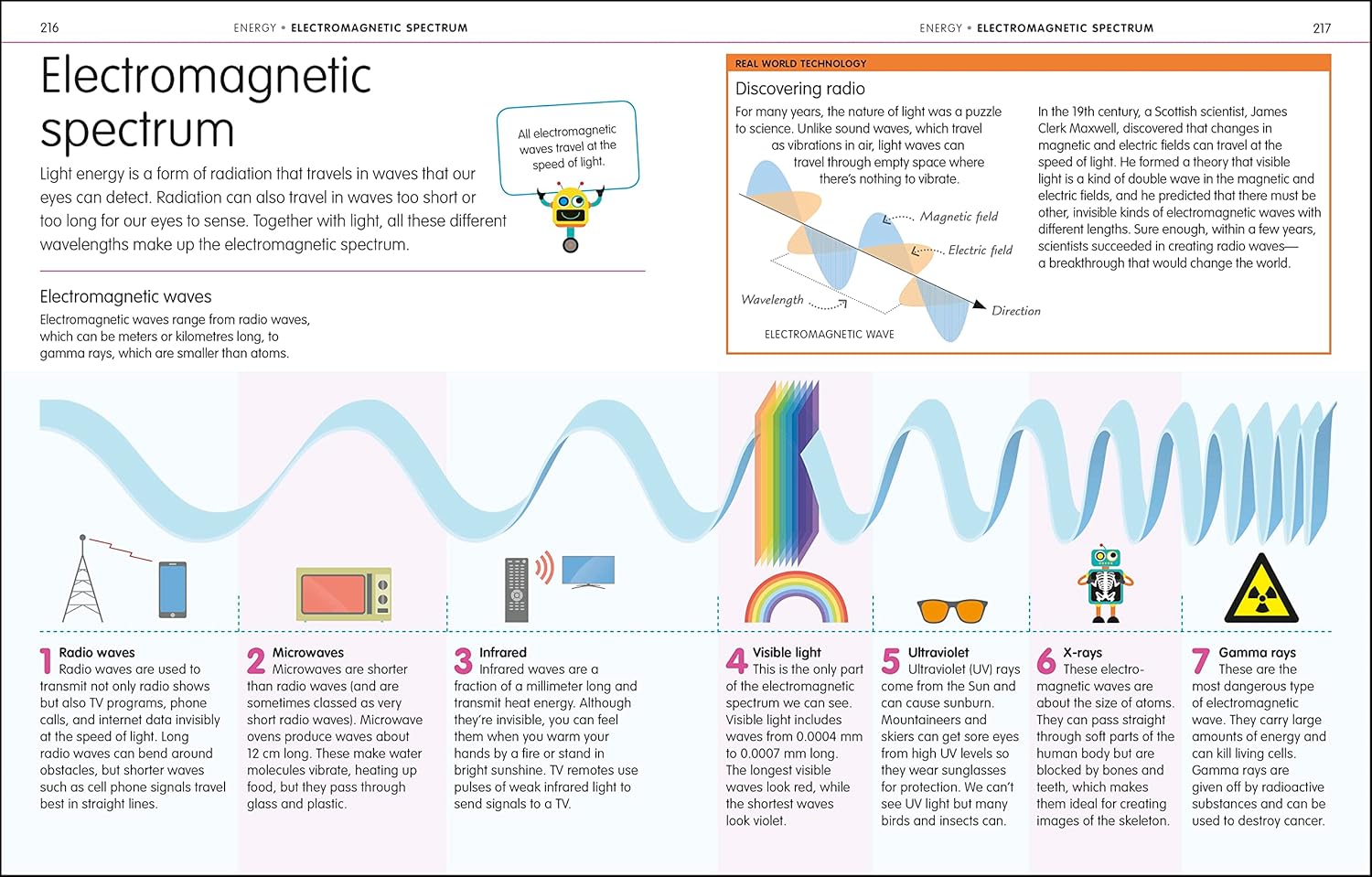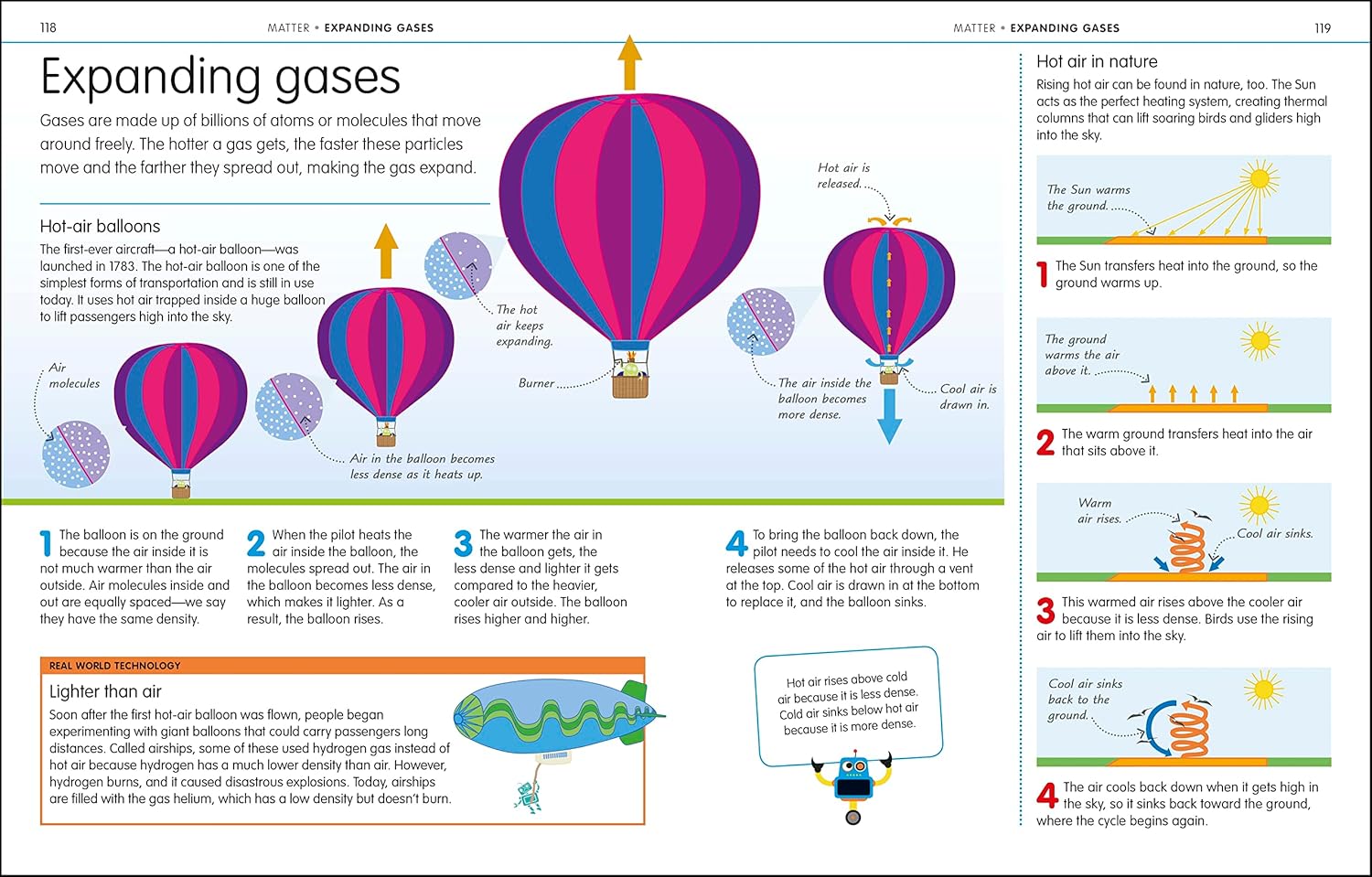 From tiny atoms and minute microchips to monster tractors and jumbo jets, this brilliant book comes packed with eye-catching illustrations to showcase science and technology in action today. You’ll see whizzing waves, zooming rockets, and mighty magnets on this epic journey of discovery. Jump in the basket to see how a hot-air balloon rises, scale a mountaintop to see the impact of erosion, and venture inside Earth to reveal its multi-layered structure. Dramatic visuals, concise explanations, and step-by-step graphics keep young readers engaged and entertained from start to finish.