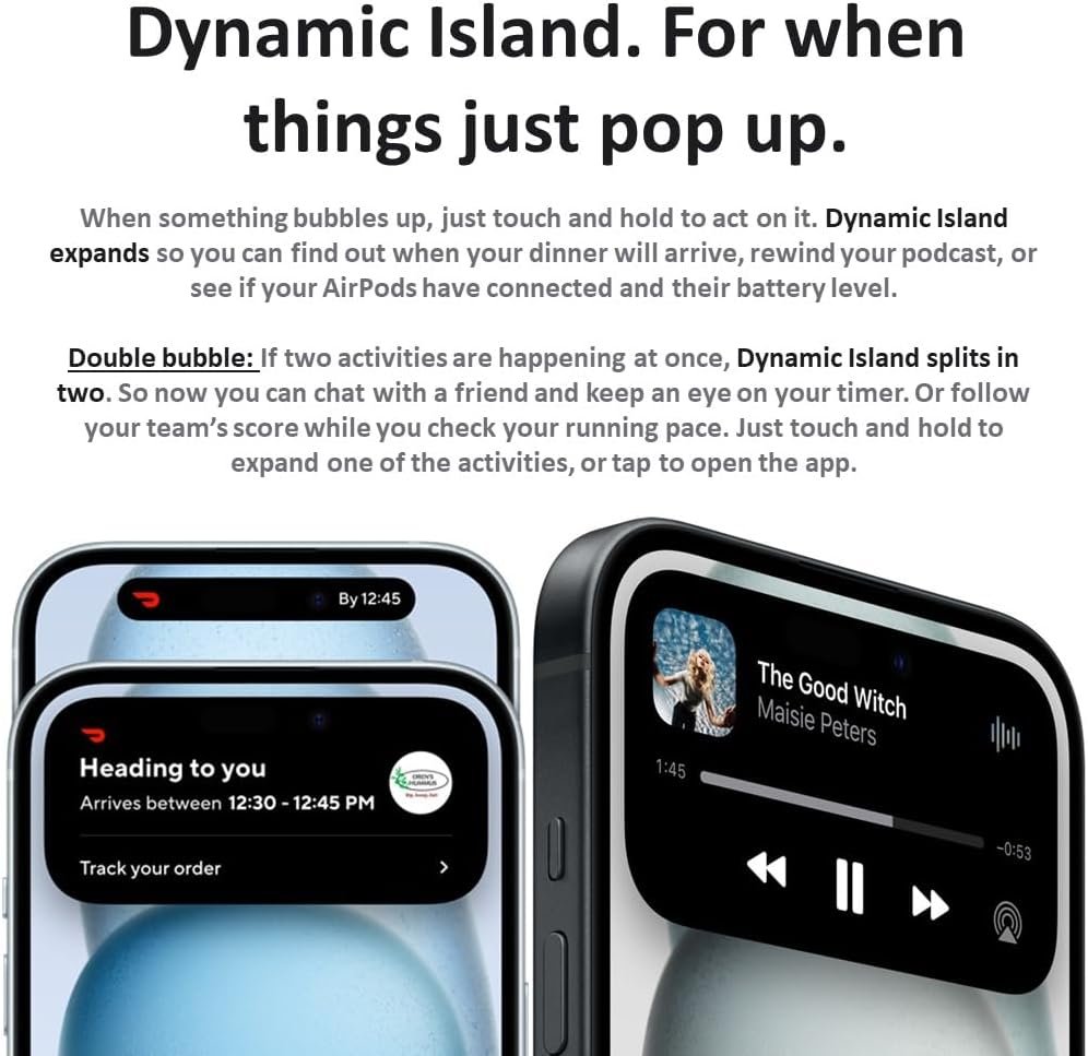 iPhone 15 brings you Dynamic Island, a 48MP Main camera, and USB-C—all in a durable color-infused glass and aluminum design.DYNAMIC ISLAND COMES TO IPHONE 15 – Dynamic Island bubbles up alerts and Live Activities so you don’t miss them while you’re doing something else. You can see who’s calling, track your next ride, check your flight status, and so much more.INNOVATIVE DESIGN — iPhone 15 features a durable color-infused glass and aluminum design. It’s splash, water, and dust resistant. The Ceramic Shield front is tougher than any smartphone glass. And the 6.1″ Super Retina XDR display is up to 2x brighter in the sun compared to iPhone 14. 48MP MAIN CAMERA WITH 2X TELEPHOTO — The 48MP Main camera shoots in super high-resolution. So it’s easier than ever to take standout photos with amazing detail. The 2x optical-quality Telephoto lets you frame the perfect close-up.NEXT-GENERATION PORTRAITS — Capture portraits with dramatically more detail and color. Just tap to shift the focus between subjects — even after you take the shot. POWERHOUSE A16 BIONIC CHIP — The superfast chip powers advanced features like computational photography, fluid Dynamic Island transitions, and Voice Isolation for phone calls. And A16 Bionic is incredibly efficient to help deliver great all-day battery life.USB-C CONNECTIVITY — The USB-C connector lets youcharge your Mac or iPad with the same cableyou use to charge iPhone 15. You can even use iPhone 15 to charge Apple Watch or AirPods. VITAL SAFETY FEATURES — If your car breaks down when you’re off the grid, you can get help with Roadside Assistance via satellite; And if you need emergency services and you don’t have cell service or Wi-Fi, you can use Emergency SOS via satellite. With Crash Detection, iPhone can detect a severe car crash and call for help if you can’t.DESIGNED TO MAKE A DIFFERENCE — iPhone comes with privacy protections that help keep you in control of your data. It’s made from more recycled materials to minimize